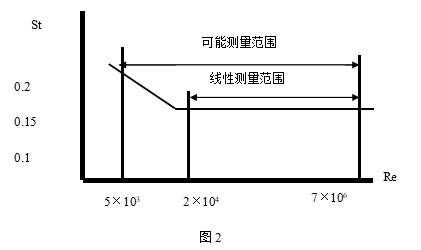 由此可見,通過測量卡門渦街分離頻率便可算出瞬時流量。其中,斯特羅哈爾數(shù)(St)是無因次未知數(shù),圖2表示斯特羅哈爾數(shù)(St)與雷諾數(shù)(Re)的關(guān)系。