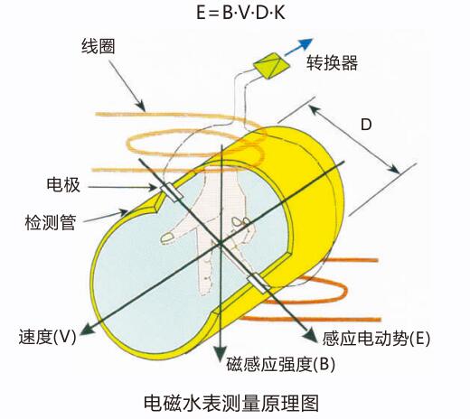 根據(jù)法拉第電磁感應(yīng)原理,在與測(cè)量管軸線和磁力線相垂直的管壁上安裝了對(duì)檢測(cè)電極,當(dāng)導(dǎo)電液體沿測(cè)量管軸線運(yùn)動(dòng)時(shí),導(dǎo)電液體切割磁力線產(chǎn)生感應(yīng)電勢(shì),此感應(yīng)電勢(shì)由兩個(gè)檢測(cè)電極檢出,數(shù)值大小與流量成正比例,其值為: