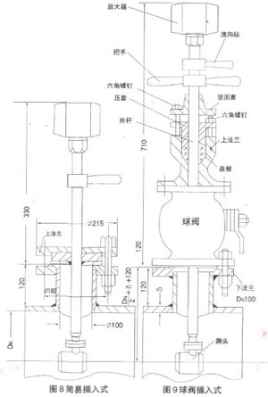 簡易插入式渦街流量計結(jié)構(gòu)見圖8,球閥插入式渦街流量計結(jié)構(gòu)見圖9,當松動六角螺釘,轉(zhuǎn)動把手將測頭提高到球閥以上時,關(guān)閉球閥,實現(xiàn)不斷流檢修。