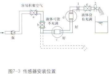 ??? 智能電磁流量計(jì)在垂直安裝時(shí),流動方向應(yīng)該自下而上,這樣才能確保傳感器始終充滿介質(zhì)。推薦的安裝位置如圖7-3中c、d所示。