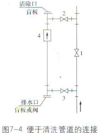 智能電磁流量計(jì)不管是水平安裝或者是垂直安裝,在連續(xù)生產(chǎn)的工藝管道上,為了不影響生產(chǎn),便于儀表維修拆裝,傳感器盡可能采用與原先主工藝管道并聯(lián)安裝(旁路管)的方式,特別對有嚴(yán)重污染要經(jīng)常清洗的液體。圖7-4所示是傳感器不卸下,在線清洗安裝實(shí)例。