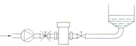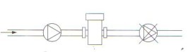 用聚四氟乙烯(PTFE)管材做的電磁流量計的傳感器襯里,它與傳感器測量管管壁一般不粘貼,因此,對真空負壓是敏感的。管道內(nèi)真空會抽癟聚四氟乙烯襯里,使襯里呈波浪型拱起——典型的負壓破壞形態(tài),這樣破壞了電極的密封,傳感器就不能工作了。因此,PTFE襯里的傳感器不能用于負壓系統(tǒng),也應盡可能避免安裝在可能產(chǎn)生瞬間負壓的地方。如傳感器不應裝在泵的吸入端;閘閥應裝在傳感器的后側(cè),如圖所示。