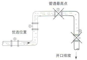 4. 電磁流量計安裝位置介質(zhì)不滿管時,可采取抬高流量管后端管路的方法,使其滿管,嚴禁在管道最高點和出水口安裝流量計。(見圖)