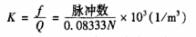 實(shí)驗(yàn)采用稱(chēng)量法,記錄電子稱(chēng)上的質(zhì)量脈沖數(shù)N,N乘以質(zhì)量脈沖常數(shù)(0.08333),即得到質(zhì)量值(kg),同時(shí)記錄時(shí)間和渦輪變送器的脈沖數(shù),在每個(gè)流量點(diǎn)重復(fù)做三次,記錄三組數(shù)據(jù),共選擇5個(gè)流量點(diǎn)來(lái)覆蓋渦輪流量計(jì)的測(cè)量量程。流量Q=0.08333N/t,儀表系數(shù)為: