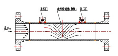 一體化智能型楔形流量計流量傳感器的檢測件是楔形孔板,它是一塊V形節(jié)流件,它的圓形頂角朝下,這樣有利于含懸浮顆粒(粉塵、泥沙及其它固體顆粒)流體和高粘度液體流過時在節(jié)流件上游側不會產(chǎn)生滯流,也不會在節(jié)流體上、下游側發(fā)生固體顆;蛘吵砦锏姆e存,從而確保楔形流量傳感器長期運行穩(wěn)定性:±0.1FS%Y,這樣高的長期運行精度在流量測量領域是迄今少見的。楔形流量傳感器的結構如圖1所示。