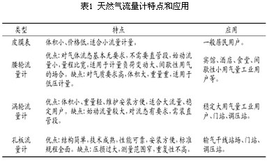 流量計的選型不對將會影響測量的精度以及使用壽命,特別是當流量計的口徑、規(guī)格、測量范圍選擇不當時,會造成“大馬拉小車或小馬拉大車”的現(xiàn)象,將嚴重影響計量的準確性。所以在天然氣流量計的選用時,應(yīng)在了解各類型流量計計量原理和特性的基礎(chǔ)上,同時結(jié)合不同的天然氣管路工況和用戶流量需求進行綜合考慮。幾種常用天然氣流量計的特點和應(yīng)用場合如表1所示。