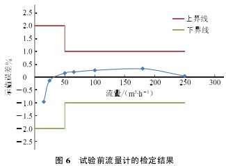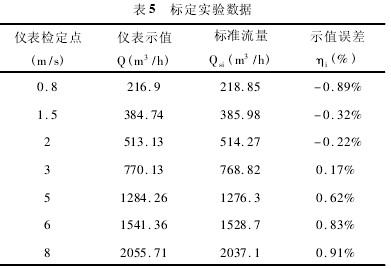 在實驗四種探頭線性度相對優(yōu)劣的基礎上,確定了一種理論上線性度好的一種探頭形狀,即形狀( 4) 。為了實際驗證這一結論,以該形狀的探頭為基礎做成試驗樣機進行標定檢驗。本文中采用容積 - 時間法[7]對形狀( 4) 的試驗樣機進行標定,可以得到其測得的儀表體積流量值和標準裝置的體積流量值,如表 5 所示。