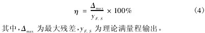 本文采用最小二乘法進行線性度評定,即擬合直線為最小二乘直線。最小二乘直線保證了傳感器實際輸出的平均值對它 的偏差的平方和為最小,即可以保證擬合直線得到的結果與實測結果之間的偏差很小,更具可靠性。根據(jù)定義,線性度即是校準曲線對這條最小二乘擬合直線的偏離程度。
