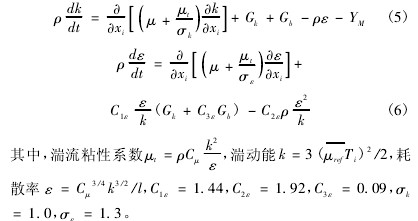 本文的湍流模型采用工程上使用廣泛的標準k-ε模型,需要求解湍動能及其耗散率方程。在該模型中,有關湍動能k和耗散率ε的運輸方程如下