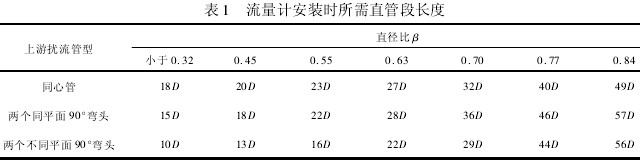 孔板流量計(jì)以簡(jiǎn)單結(jié)實(shí)、成本低廉及無需額外標(biāo)定等優(yōu)勢(shì)在工業(yè)中獲得廣泛應(yīng)用。但它也有自身的缺點(diǎn): 受限于工作原理,量程比限制在3∶ 1 ~ 5∶ 1; 在水錘作用下,孔板會(huì)變形,如果設(shè)計(jì)或安裝不當(dāng)甚至?xí)氯艿? 孔板的直角邊緣在長(zhǎng)期運(yùn)行后會(huì)磨損,特別是在進(jìn)行蒸汽介質(zhì)測(cè)量時(shí)會(huì)改變孔板特性,影響測(cè)量精度,因此必須對(duì)孔板進(jìn)行周期檢查并予以更換; 孔板流量計(jì)一般需要較長(zhǎng)的直管段以保證精度,表 1 給出了不同直徑比 β 和不同上游擾流布置情況下所建議的直管段長(zhǎng)度。