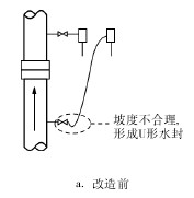 用差壓流量計(jì)測(cè)量蒸汽流量,為保護(hù)差壓變送器的高低壓室,通常設(shè)置兩個(gè)冷凝罐,兩個(gè)冷凝罐內(nèi)液位高度相等是壓差信號(hào)不失真?zhèn)鬟f的關(guān)鍵。如果發(fā)現(xiàn)一個(gè)冷凝罐是冷的,罐的上部必定不是蒸汽,造成這種情況的原因有多種,如:導(dǎo)壓管堵、根部閥堵、溢流口高度比取壓口低、在取壓口和冷凝罐之間存在液封等。不管是哪種原因,都將使差壓變送器接收到的壓差與節(jié)流件送出的壓差信號(hào)不相等,進(jìn)而引起流量測(cè)量誤差。如圖1所示,改造前到正壓冷凝罐的引壓管由于安裝坡度不合理形成U形水封,這段管內(nèi)的冷凝水不能靠重力流回母管,從而造成流量示值偏低。配置和安裝合理的壓差裝置后,蒸汽從母管經(jīng)導(dǎo)壓管流入冷凝罐,放出熱量后變成凝結(jié)水,罐中液位高于溢流口后自動(dòng)返回母管,從而保證兩個(gè)罐中的凝結(jié)水液位相等。