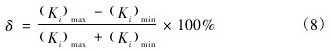 式中: ( Ki)max、( Ki)min分別指在整個流量范圍內(nèi),各流量點(diǎn)儀表系數(shù)的最大值和最小值。