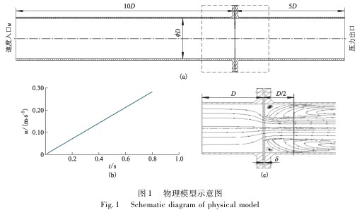 圖1為孔板流量計(jì)的物理模型示意.根據(jù)標(biāo)準(zhǔn)孔板流量計(jì)的安裝,圖1a中,上下游直管段長(zhǎng)分別取10D和5D作為穩(wěn)定直管段.其中上下游管內(nèi)徑D取100mm,孔板厚度δ取3mm.