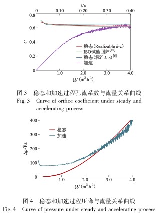 對(duì)于流量Q≤0.6m3/h,C0隨流量的增加緩慢下降,之后保持在0.63左右.與C0不同的是,C從0開(kāi)始隨流量的增大而增大,并逐漸向C0靠近,直至Q≥3.5m3/h后才達(dá)到C0的水平.C在時(shí)間上滯后于C0.圖4中△p-Q曲線顯示,Q≤3.0m3/h時(shí),加速過(guò)程孔板前后壓降高于同等流量下穩(wěn)態(tài)壓降;Q≥3.0m3/h后,瞬態(tài)壓降才降為穩(wěn)態(tài)水平.