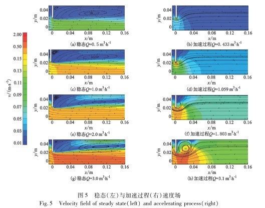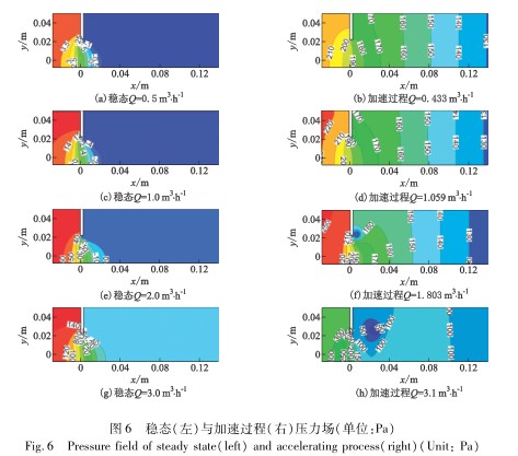 從內(nèi)流角度分析導(dǎo)致第2.1節(jié)中C和C0不同的原因,圖5和圖6分別給出并對(duì)比了相同流量下穩(wěn)態(tài)和加速過(guò)程中流經(jīng)孔板前后流體的速度和壓力場(chǎng).對(duì)于Q≤3.0m3/h穩(wěn)態(tài)條件,孔板后方始終可觀察到一個(gè)被拉長(zhǎng)的主渦和孔板右上方的小渦,流動(dòng)的損失較大,同時(shí)表明流場(chǎng)中已形成穩(wěn)定的流動(dòng)通道,動(dòng)能和壓能的轉(zhuǎn)化已達(dá)到平衡,流動(dòng)的損失(長(zhǎng)漩渦)也趨于穩(wěn)定,并且壓差隨流量的增大而穩(wěn)定增大.