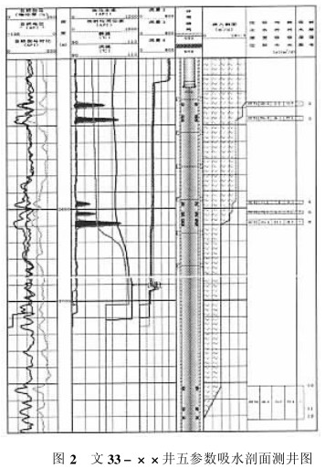例如: 圖2是文 33-××井五參數(shù)吸水剖面測(cè)井圖,測(cè)井在2690m遇阻,第10、11、12" 號(hào)層未測(cè)出,但經(jīng)電磁流量計(jì)測(cè)井曲線顯示,這3個(gè)遇阻層吸水,絕對(duì)吸水量為74.6m3/d,相對(duì)吸水量為41.2%。