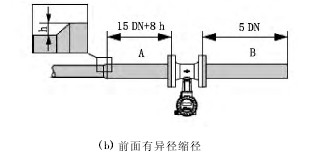 (2)渦街流量計對最小直管段的要求見圖2。當(dāng)現(xiàn)場存在2個或過多干擾源時,建議遵循最長的直管段要求。圖2中的A表示前直管段,B表示后直管段,h表示管道擴徑時產(chǎn)生的高度差;DN為管道直徑。