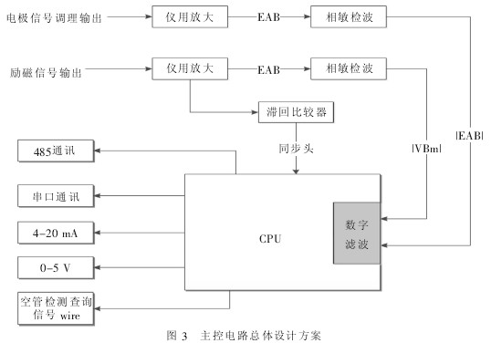 (2)主控制電路上通過(guò)相敏檢波等一系列硬件電路再結(jié)合軟件進(jìn)行相位補(bǔ)償和零位補(bǔ)償進(jìn)一步消除正交干擾信號(hào)和同相干擾! 榱吮WC測(cè)量的實(shí)時(shí)性和準(zhǔn)確性,先將勵(lì)磁信號(hào)和感生電勢(shì)信號(hào)進(jìn)行數(shù)字濾波,再利用軟件算法進(jìn)行除法運(yùn)算得到流速信號(hào),借此來(lái)得到穩(wěn)定的實(shí)時(shí)流速。
