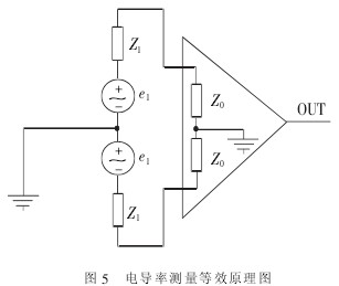 其中S1、S2分別為兩個(gè)電極,其等效原理如圖5所示。電路為對(duì)稱(chēng)結(jié)構(gòu),圖中e1和Z1分別是傳感器的流量信號(hào)和對(duì)應(yīng)的流體阻抗,Z0為放大器的輸入阻抗。