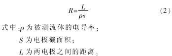 采用絕對(duì)電導(dǎo)率測(cè)量方法,既可方便流量計(jì)獨(dú)立使用,也克服了相對(duì)電導(dǎo)率方法的弊端。解決的難點(diǎn)在于:一是如何將空管檢測(cè)信號(hào)與正常流速信號(hào)分離開(kāi),二是如何在信號(hào)線上走電源信號(hào)。解決的方法在于空管檢測(cè)信號(hào)利用高頻激勵(lì)與50Hz流速信號(hào)區(qū)分開(kāi),但是頻率過(guò)高容易引起電極間電容產(chǎn)生極化效應(yīng)且不利于PCB布板,最后綜合考慮使用周期為16μs的高頻正弦波勵(lì)磁。將空管檢測(cè)信號(hào)采用數(shù)據(jù)流進(jìn)行傳輸,實(shí)現(xiàn)信號(hào)線的單線復(fù)用。為了保證微弱的空管檢測(cè)信號(hào)不失真?zhèn)鬏敚诹髁坑?jì)信號(hào)調(diào)理板上就近進(jìn)行信號(hào)處理后,通過(guò)屏蔽電纜傳輸至主控電路?展軝z測(cè)信號(hào)采用單片機(jī)控制,可定時(shí)采集當(dāng)前流體的電導(dǎo)率,與空管檢測(cè)的閾值相比較,還可采樣勵(lì)磁電流并判斷勵(lì)磁是否出現(xiàn)開(kāi)路或者短路故障。兩電極之間流體電阻計(jì)算公式如下:
