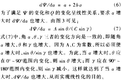 連桿8、9、10的長(zhǎng)度分別為A、B、C,連桿8與平衡桿6固定在一起,指針與連桿ro固定在一起。要求轉(zhuǎn)角少的變化和流量Q的變化呈線性關(guān)系,這樣可用d空代替d口,用da代替d人,代人公式(5)得