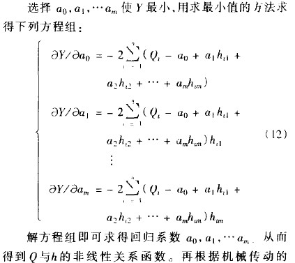 由于每臺(tái)流量計(jì)的錐管和浮子的加工誤差不可能一致,每臺(tái)金屬管轉(zhuǎn)子流量計(jì)的流量值p和浮子位移h的作線性關(guān)系也不可能一樣,所以在實(shí)際制造時(shí)流量計(jì)的凸輪都要逐臺(tái)校驗(yàn)加工,設(shè)口與h的非線性回歸模型為