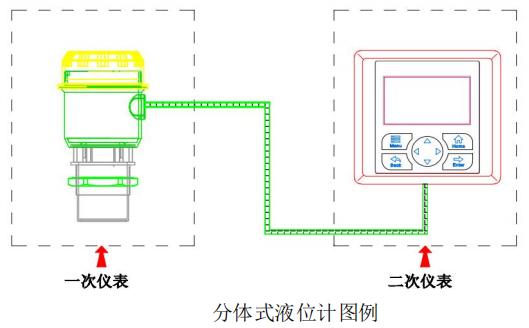 分體式由顯示儀表(二次儀表)和超聲波傳感器(一次表)兩部分組成,結(jié)構(gòu)如下(外觀尺寸見6.1.1):