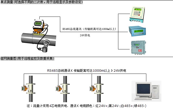一次表與二次表(或計(jì)算機(jī))之間采用RS-485總線通訊,采用普通電纜即可,傳輸距離可達(dá)1000米以上,組網(wǎng)十分方便、快捷。這種傳輸方式抗干擾能力佳,解決了分體式超聲波流量計(jì)專用電纜成本高、抗干擾能力差、傳輸距離短等問(wèn)題。