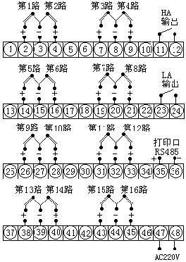 報警輸出: ⑴1-64通道統(tǒng)一上下限報警,繼電器輸出觸點容量 AC220V/3A